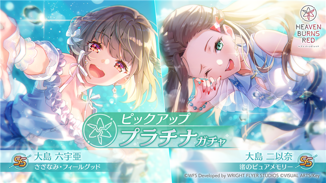 今回のピックアッププラチナガチャは、新スタイルのSS[渚のピュアメモリー] 大島二以奈、SS[さざなみ・フィールグッド] 大島六宇亜がピックアップされ、提供割合がアップする。