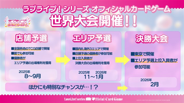『LoveLive! Masters Tournament』はラブカ初の世界大会。8月から全国各地のTCG店舗で店舗予選を行い、店舗予選で優勝したプレイヤーが11月より各地域で開催されるエリア予選への出場権を獲得できる。そして、エリア予選で上位入賞を果たしたプレイヤーが、来年2026年2月に東京で開催される決勝大会へと駒を進める。