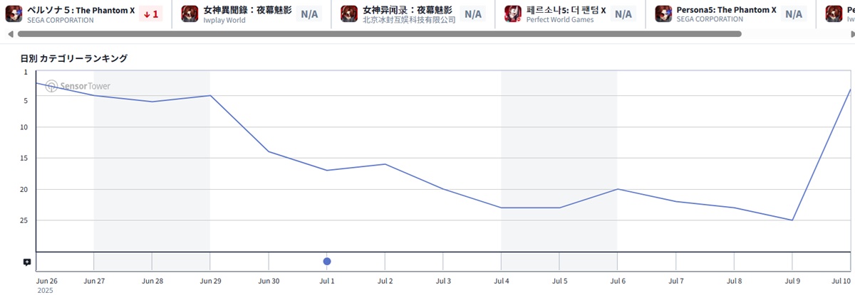 セガの『ペルソナ5: The Phantom X』が25位から4位に浮上した。