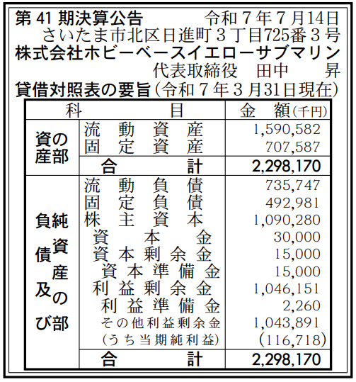 ホビーベースイエローサブマリンの2025年3月期(第41期)の決算は、最終利益が前の期比27.8%減の1億1600万円と減益だった。前の期(2024年3月期)の実績は、最終利益1億6100万円だった。7月14日付の『官報』に掲載された「決算公告」で判明した。