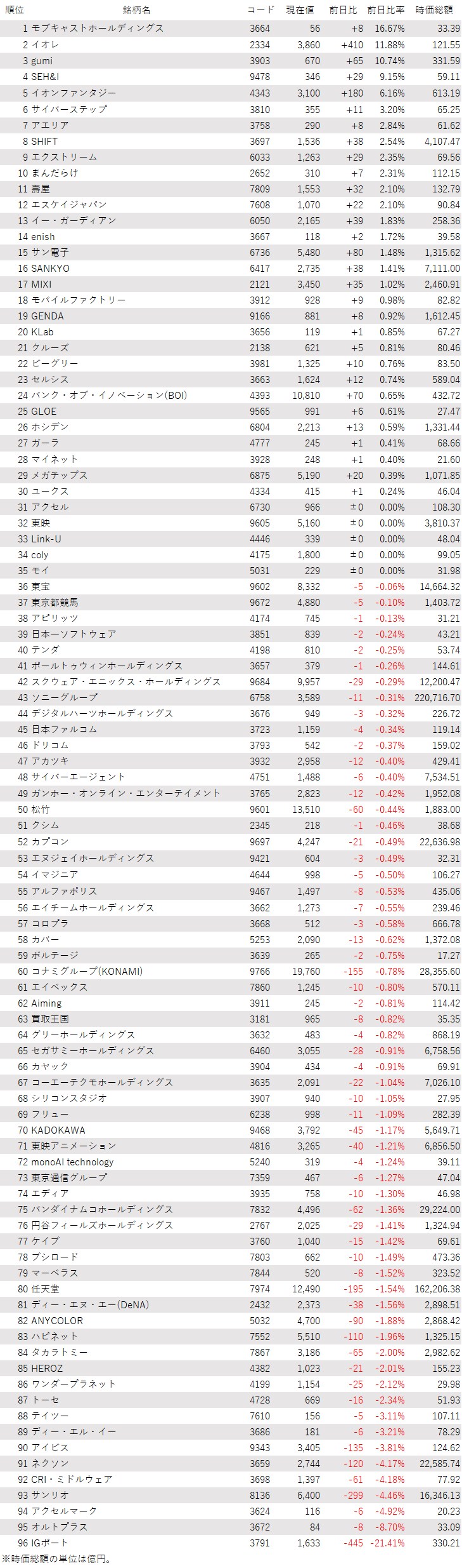 そうした中でゲーム・エンタメ関連株の動きを見てみると、下記の表に登録しているゲーム・エンタメ関連企業96銘柄のうち、上昇は30銘柄(31%)、下落は61銘柄(64%)、変わらずは5銘柄(5%)で、下落した銘柄の方が多かった。
