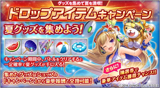 キャンペーンの開催期間中、宝箱が出現する全てのバトルで「夏グッズ」が入った宝箱が出現する。ショップ「キャンペーン」において、集めた特定の「夏グッズ」を豪華報酬や「夏の抽選券」と交換することができる。「夏の抽選券」は最大で100枚ゲットでき、後日行われる抽選で豪華アイテムが当たる。バトルをクリアして、夏グッズを集めよう!
