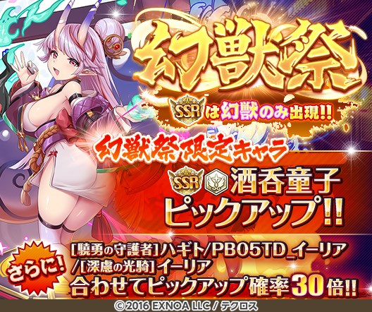 出現するSSRはすべて幻獣のみのガチャイベント「幻獣祭」を開催!さらに幻獣祭限定幻獣「酒呑童子」などがピックアップ!この機会をお見逃しなく!
