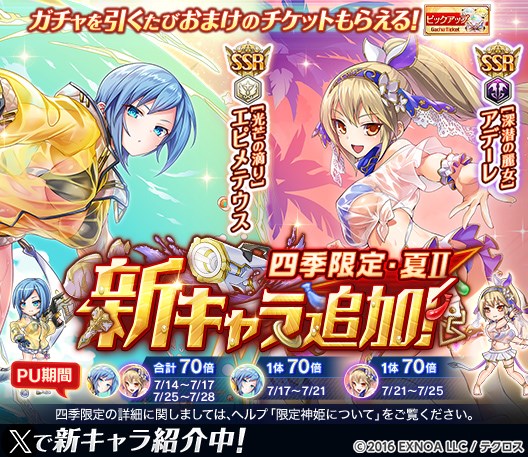 EXNOAは、『神姫PROJECT』において、「エピメテウス」「アデーレ」が新衣装で登場することを発表した。さらに7月7日にプレミアムパスが更新された。