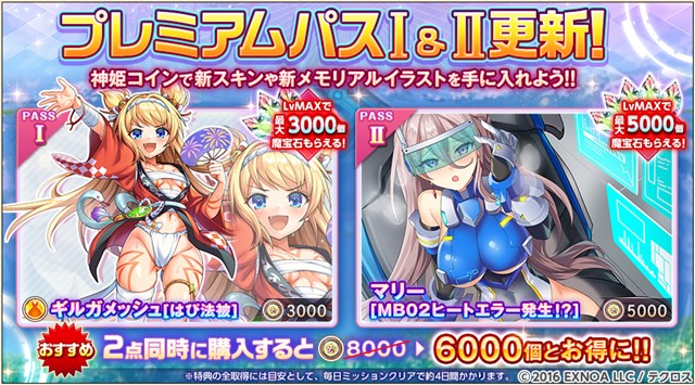 ゲームをプレイして専用のミッションをクリアする事で、プレミアムパスLvが向上し、Lvに応じた追加特典を獲得できる。神姫コインで購入できるプレミアムパスⅠ・Ⅱの追加特典には、なんと新たな英霊スキンやメモリアルイラストも!詳細はゲーム内で確認できる。