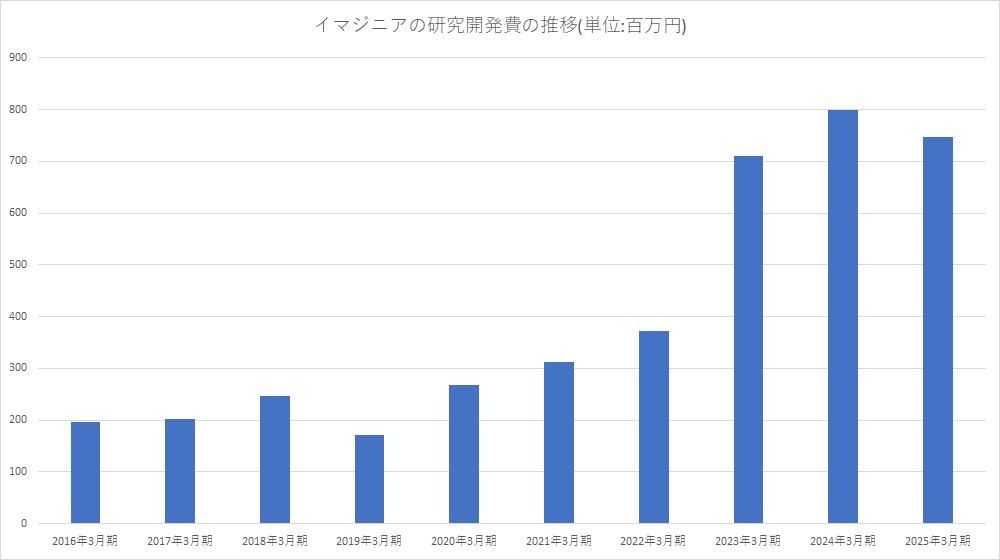 イマジニア<4644>の2025年3月期の研究開発費は、前の期比6.5%減の7億4700万円だった。前の期(2024年3月期)の実績は、7億9900万円だった。