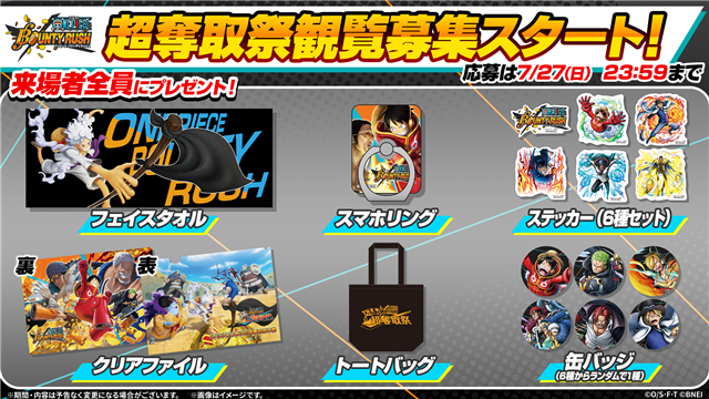 バンダイナムコエンターテインメントは、『ONE PIECE バウンティラッシュ』において、イベント企画として7月14日より第3回超奪取祭の観覧者募集を開始したことを発表した。8月23日に開催予定の本戦に抽選で招待する。超奪取祭の白熱した戦いを会場で観戦しよう!来場者には豪華ノベルティをプレゼント予定。