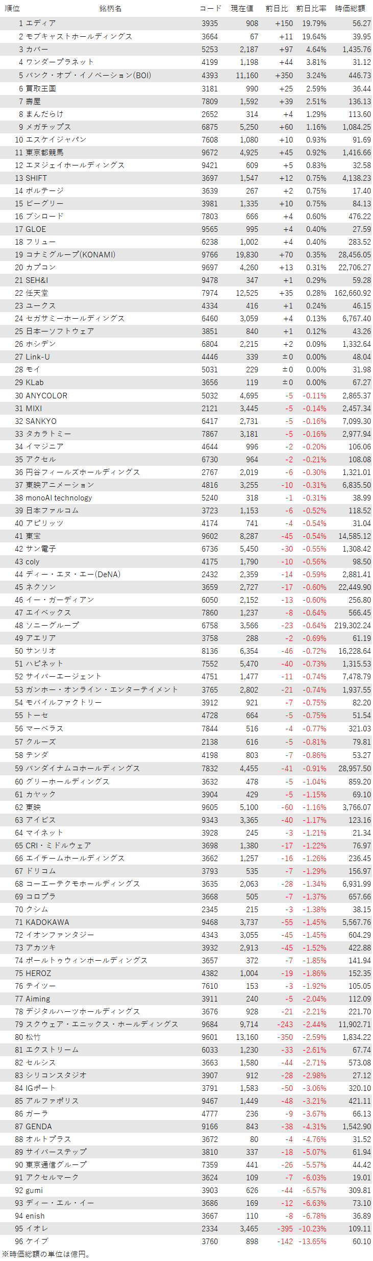 こうしたなか、ゲーム・エンタメ関連企業をみると、登録されている96銘柄のうち、上昇は26銘柄(27%)、下落は67銘柄(70%)、変わらずは3銘柄(3%)で、下落した銘柄の方が多かった。