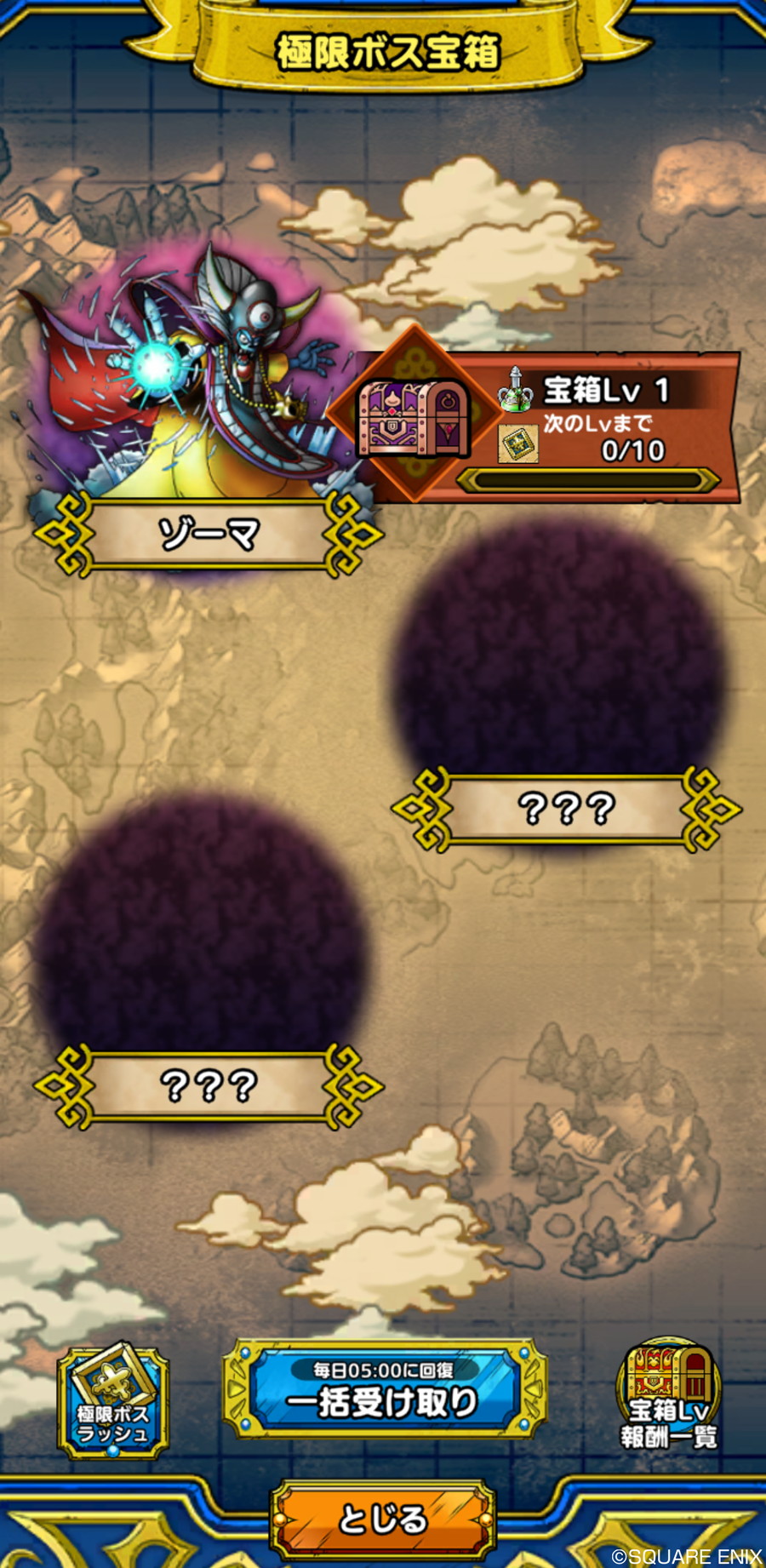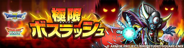 「極・ドラゴンクエスト III イベント」開催期間中は第 3 弾までボスが登場し、第 1 弾では「ゾーマ」が登場する。ボスを倒すと手に入る討伐ポイントで極限ボス宝箱のレベルが上がり、レベルを上げることでより多くの報酬が手に入る。