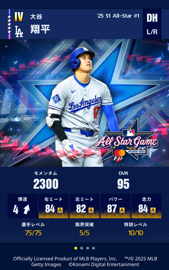今回登場した新バージョンの大谷選手は、これまでに『メジャスピ』で登場した大谷選手のOVR(総合的な能力の高さを表す数値)を更新し、過去最高の「95」に!パワー「87」と走力「84」も、『メジャスピ』に登場する大谷選手として過去最高の数値となっている。
