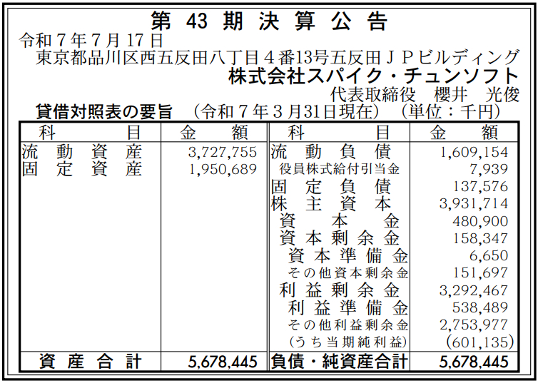 スパイク・チュンソフトの2025年3月期(第43期)の決算は、最終利益が前の期比24.1%減の6億0100万円と減益だった。前の期(2024年3月期)の実績は、最終利益7億9300万円だった。7月17日付の『官報』に掲載された「決算公告」で判明した。