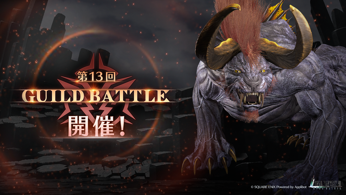 本日より、ギルドランキング「第13回ギルドバトル」を開始した。ギルドバトルは、1日に1人3回挑戦し、ギルドメンバーと協力してボスに挑むランキングイベントだ。各難易度のボスごとに与えたダメージがギルドメンバーに共有され、与えたダメージに応じてスコアを獲得できる。第13回開催は炎属性が有利となる。炎属性のパーティ編成を準備して挑戦しよう。