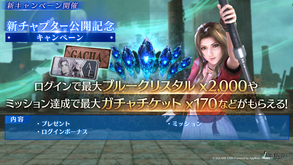 また新チャプター公開に合わせ、「新チャプター公開記念キャンペーン」を開催。ミッションクリアやログインで、合計ブルークリスタル×2,000やキャラクター専用を含むガチャチケット×170などを獲得できるキャンペーンになっている。