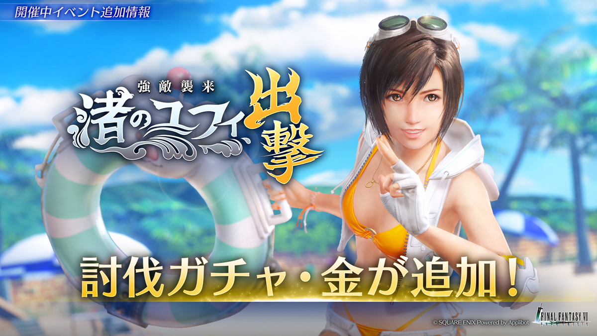 本日より、開催中の「強敵襲来 渚のユフィ出撃」について、新しくイベントを追加した。新たに追加された「討伐ガチャチケット・金」を使用して討伐ガチャを引くことで、ユフィ専用武器「ふりふりモーグリ」やユフィ専用のウェポンパーツ、メモリーなどが獲得できる。