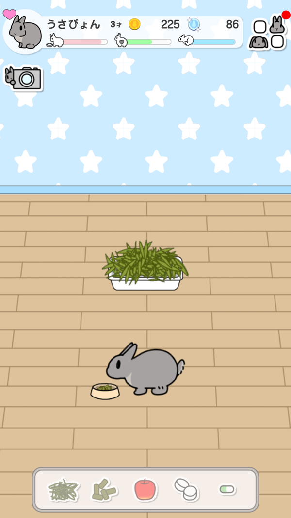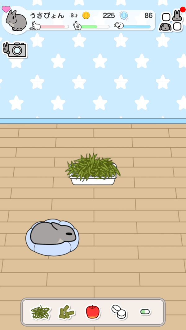 ミニゲーム「おさんぽ」などで集めたコインを利用して、お部屋に家具を配置して模様替えをしたり、うさぎさんにアクセサリーを付けたりすることができる。