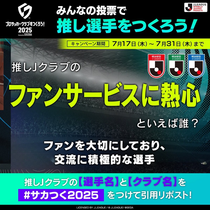 ② 該当の投稿を引用リポストで、「ファンサービスに熱心」にぴったりな【選手名(フルネーム)】&【クラブ名】を #サカつく2025 をつけて投稿