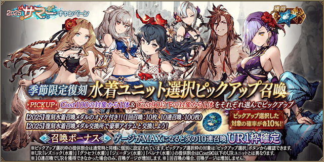「2025サマーキャンペーン」開催に合わせて、過去登場した水着ユニットが獲得できる「季節限定復刻水着ユニット選択ピックアップ召喚」を開催する。過去取り逃してしまった方は、この機会をぜひご活用ください。