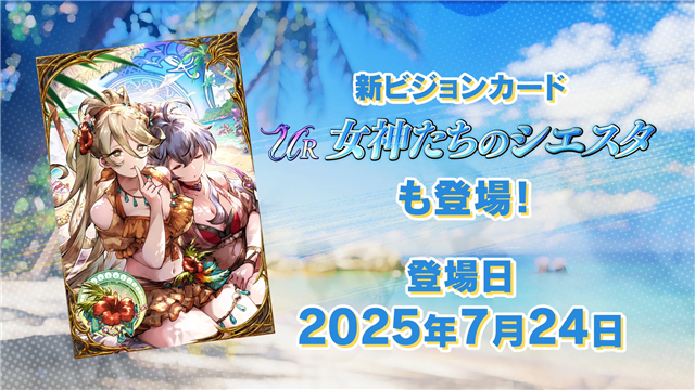 7月24日より、新ビジョンカード「女神たちのシエスタ」の登場を予定している。さらに、新ビジョンカードの登場確率がUPする、ピックアップ召喚も同日より開催を予定している。