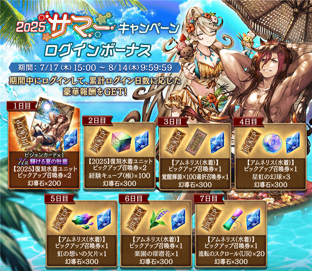 期間限定の新ユニット「アムネリス(水着)」登場に合わせて、「2025 サマーキャンペーンログインボーナス」を開催する。【アムネリス(水着)】ピックアップ召喚券、復刻ビジョンカード「輝ける夏の牡鹿」、【2025】復刻水着ユニットピックアップ召喚券や、最大 2,000 個の幻導石などの豪華アイテムが、ログインするたび獲得できる。