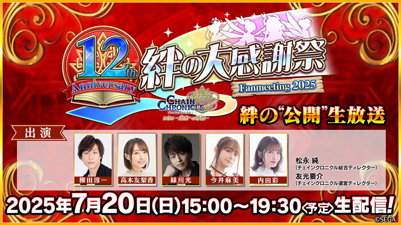 セガは、本日(7月18日)、『チェインクロニクル』が2025年7月26日にサービス12周年を迎えることを記念して、おなじみの豪華声優陣をゲストに迎えて開催するファン感謝イベント「チェインクロニクル 12th Anniversary 絆の大感謝祭 Fanmeeting 2025」を7月20日に東京 大崎ガーデンタワー(セガ本社)で実施する。