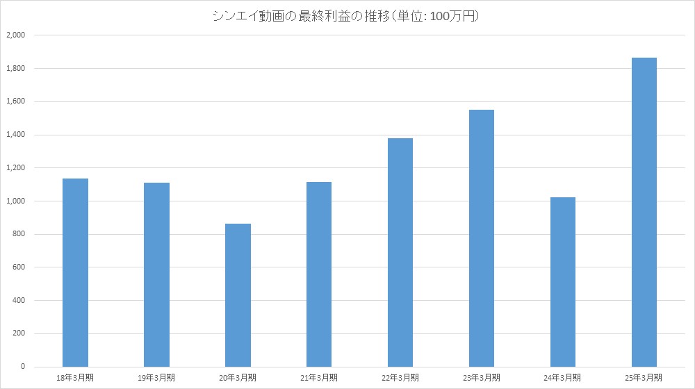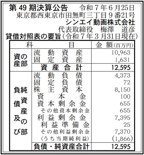 シンエイ動画の2025年3月期(第49期)の決算は、最終利益が前の期比82.4%増の18億6600万円と大幅増益を達成した。前の期(2024年3月期)の実績は、最終利益10億2300万円だった。7月18日付の『官報』に掲載された「決算公告」で判明した。