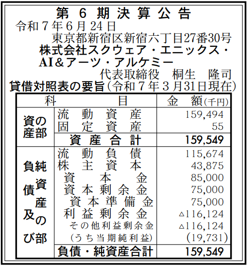 スクウェア・エニックス・ホールディングス<9684>の子会社であるスクウェア・エニックス・AI&アーツ・アルケミーの2025年3月期(第6期)の決算は、最終利益が1900万円と黒字転換を達成した。前の期(2024年3月期)の実績は、最終損失3500万円だった。7月18日付の『官報』に掲載された「決算公告」で判明した。
