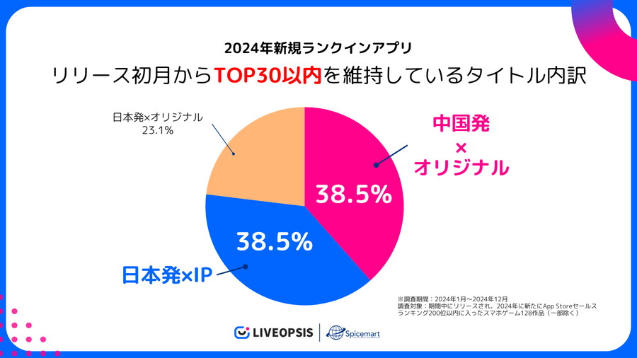 スパイスマートは、スマホゲーム専門の運営ソリューション『LIVEOPSIS』の「新規ランクインアプリ」機能を活用し、2024年に新たにApp Storeセールスランキング200位以内に入ったスマホゲームを調査した。対象となった128作品についてジャンル別傾向、IP活用状況、パブリッシャーの地域分布、ランキング初動順位などを集計し、新作アプリのトレンドを分析している。