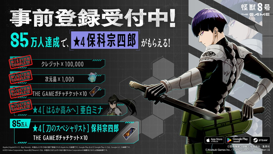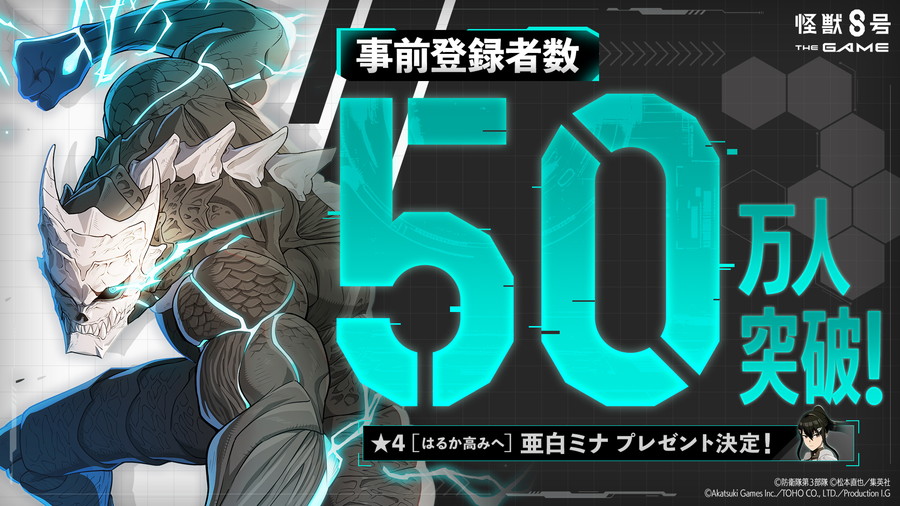 アカツキゲームスと東宝、プロダクションI.Gは、この日(7月20日)、『怪獣8号』を題材としたスマートフォン・PC向けゲーム『怪獣8号 THE GAME』について、事前登録者数が50万人を突破したことを明らかにした。ゲーム内で使用できる★4 [はるか高みへ]亜白ミナの配布が決定した。さらに事前登録85万人を達成すると、★4 [刀のスペシャリスト]保科宗四郎を配布することも決定した。