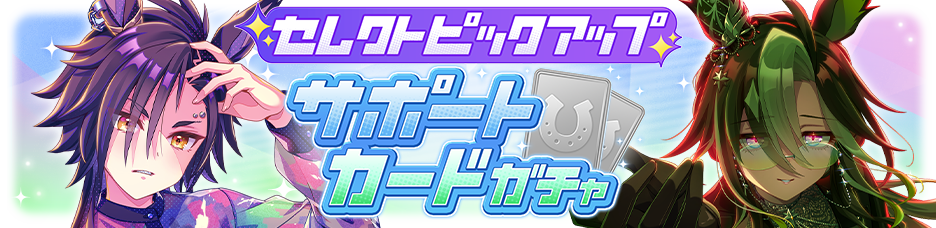 「セレクトピックアップ サポートカードガチャ」では、下記「■ピックアップサポートカード候補」に記載のSSRサポートカードの中から2枚を選び、「ピックアップ選択サポートカード」として設定できる。