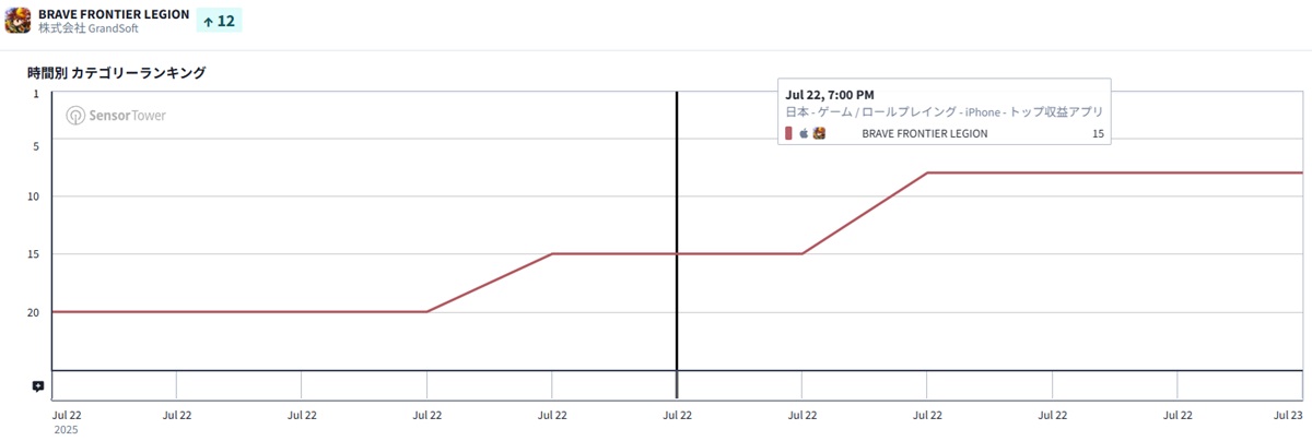 またこの日、GrandSoftが7月22日にリリースした、新作スマホゲーム『BRAVE FRONTIER LEGION』が22位にランクインした。