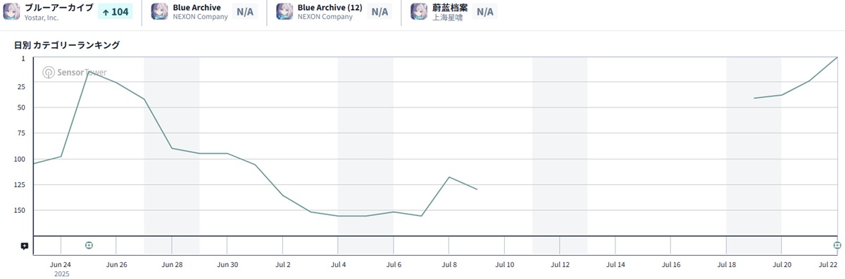 | 1 | 13 | ↑12 | ブルーアーカイブ -Blue Archive- | Yostar |