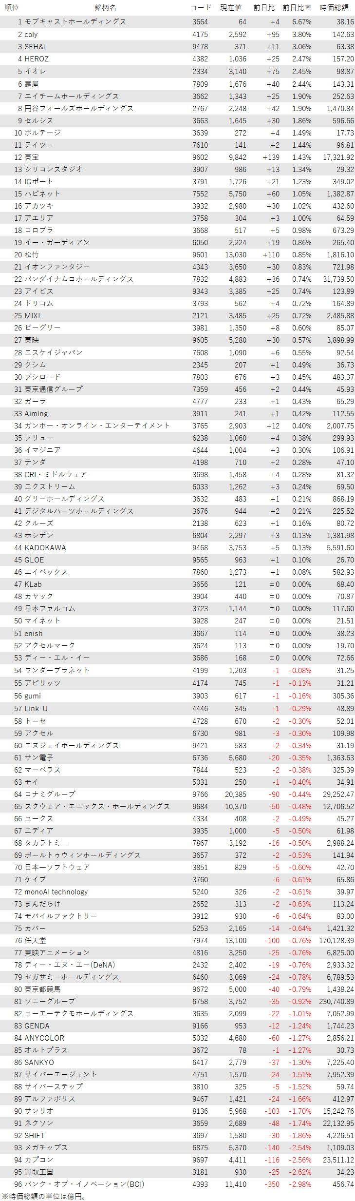 こうしたなか、ゲーム・エンタメ関連企業をみると、登録されている96銘柄のうち、上昇は46銘柄(48%)、下落は43銘柄(45%)、変わらずは7銘柄(7%)で、上昇した銘柄のほうが多かった。