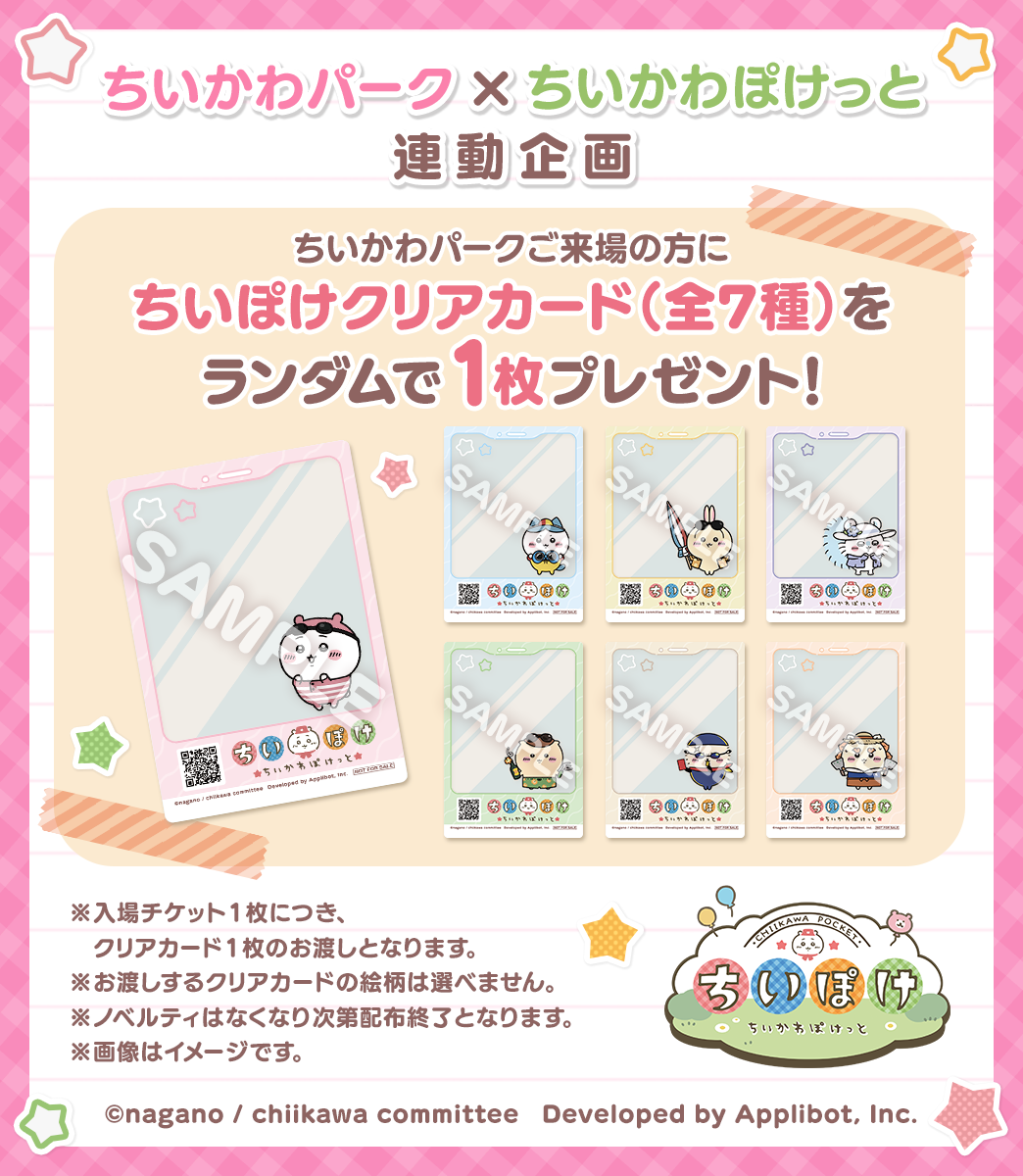 2025年7月28日(月)にグランドオープンする「ちいかわパーク」にて「ちいぽけクリアカード(全7種)」を配布することが決定し、この度絵柄を公開した。