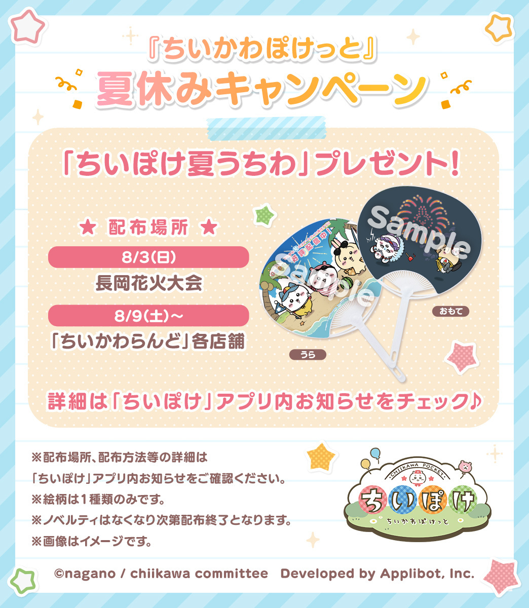 長岡まつり大花火大会と、全国の「ちいかわらんど」にて、「ちいぽけ夏うちわ」の配布が決定した。