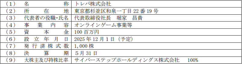 これに伴いオンラインクレーンゲーム・トレバ事業を「トレバ株式会社」、オンラインゲーム事業とエンターテインメント事業を「サイバーステップ株式会社」、暗号資産関連事業を「CrypTech Capital株式会社」と新設会社にそれぞれ移管する。