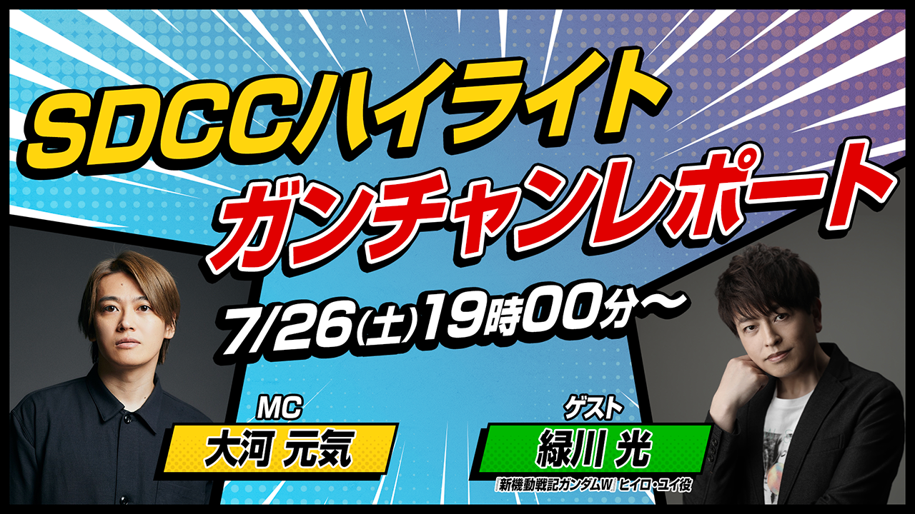 ガンダムシリーズの最新情報が解禁されたパネルイベント「GUNDAM Showcase - Featuring30Years of Gundam Wing」の収録映像を振り返りながら、「ガンダムW30周年」の最新情報をお届けする「SDCC特別番組」の配信が決定。ゲストに緑川 光さん、MCとして大河元気さんが出演、ガンダム公式YouTubeチャンネル「ガンダムチャンネル」で、7月26日19:00よりライブ配信を実施する。