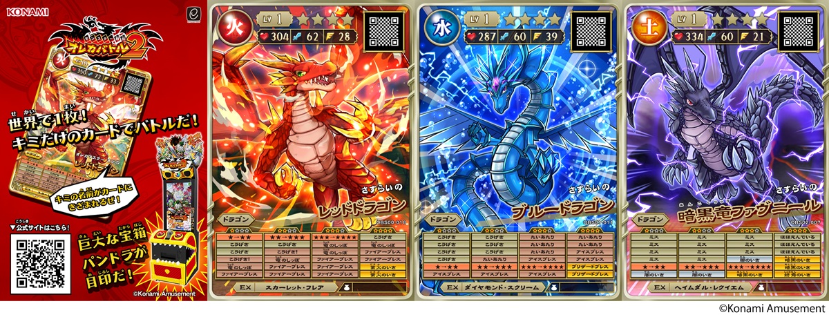 もらえるモンスター「レッドドラゴン」、「ブルードラゴン」、「暗黒竜ファヴニール」はそれぞれ「~序章~ 勇者の目覚め」、「~第1章~ 魔海の竜宮」、「~第2章~ 砂縛の要塞」の物語を代表するドラゴンです。もらったカードはすぐにゲーム機で使える。