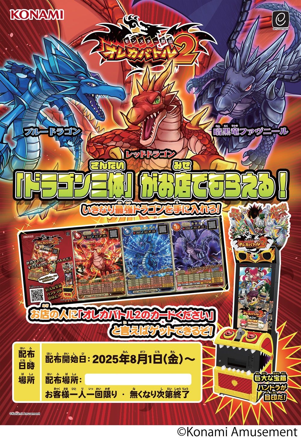 この夏、全国にある『モンスター烈伝 オレカバトル2』が遊べるアミューズメント施設にて、『モンスター烈伝 オレカバトル2』各章に登場する強力なドラゴンのモンスター「レッドドラゴン」、「ブルードラゴン」、「暗黒竜ファヴニール」のカード3枚セットが無料でもらえるほか、株式会社小学館から発売されるコミックス『モンスター烈伝 オレカバトル2』第1巻に、付録として石井敬士先生描きおろしのイラストを使用したモンスター「ゼノゴン」のカードが付く。