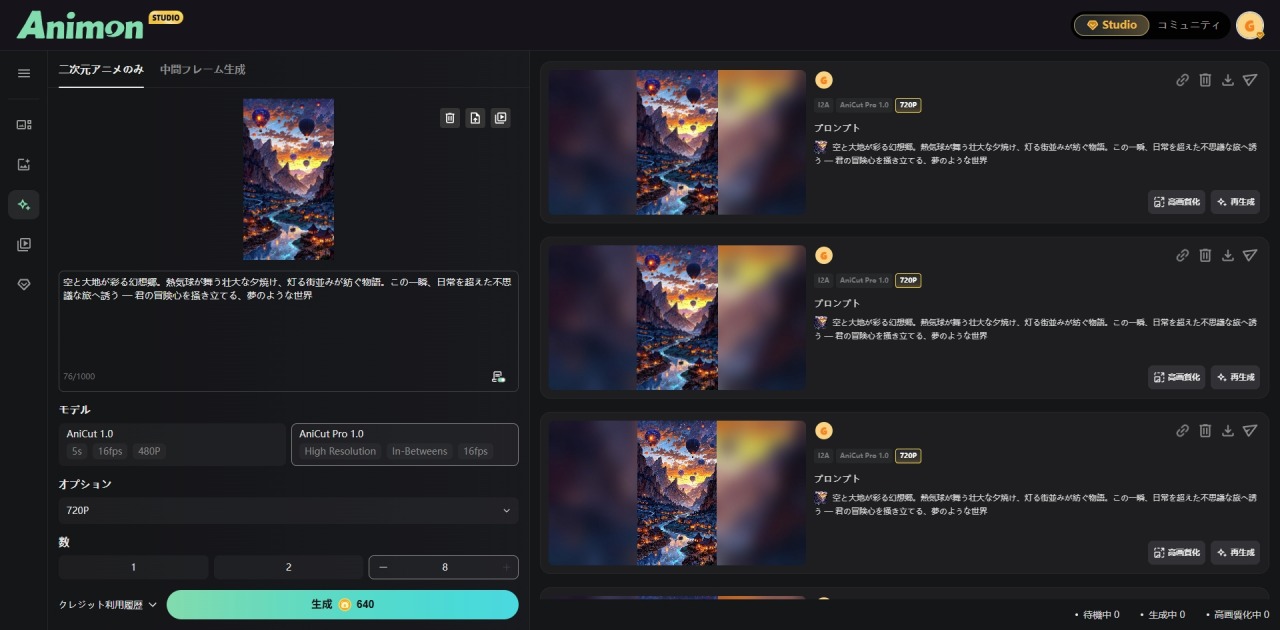 アニメ制作をもっと簡単に、もっと自由に。『Animon Studio』は、アニメ制作に欠かせない1.画像生成 2.フレーム編集 3.動画出力という3つの主要工程をワンストップで強化し、誰もがプロ品質のアニメーションを手軽に制作できるよう設計されている。