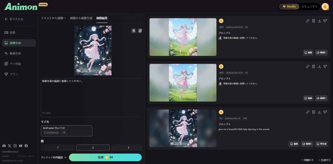 生成した画像に対し、キャラクターのポーズ変更、背景の差し替え、色調の調整など、細かな演出が行える「Image-to-Image」編集機能を搭載している。背景置換、ポーズ調整、スタイル変更、部分修正、色調整、要素の追加・削除などの精密な編集操作に対応し、シーンごとの表現をより緻密にコントロール利用できる。異なるアスペクト比での生成が可能で、最大8つの候補画像から最適なものを選択できるため、アニメーション全体の一貫性を保ちながら、自由度の高い制作が可能。これにより、シリーズアニメ制作において重要な「キャラクター画像の一貫性制御が困難」という長年の課題を解決する。