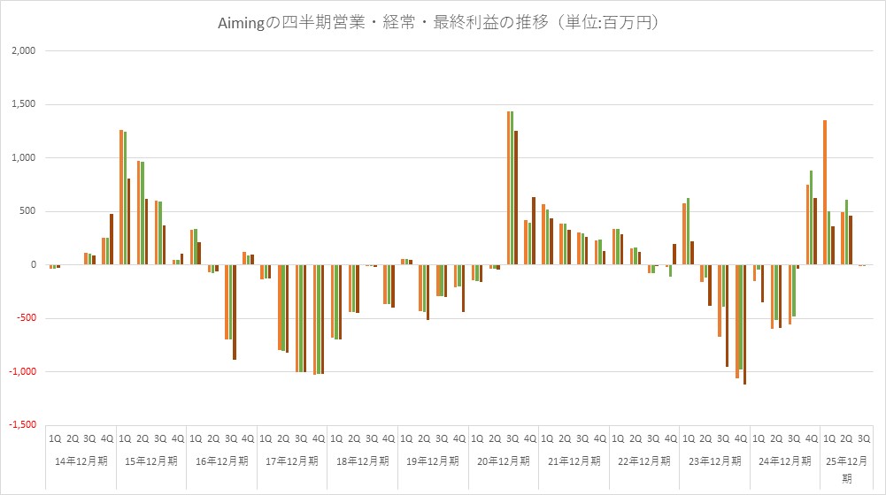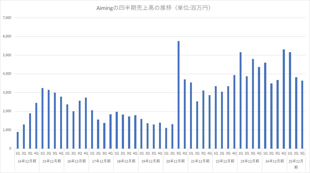 Aiming<3911>は、第3四半期(2025年7~9月)の連結決算について、売上高36億4900万円(前四半期比4.5%減)、営業損失900万円(前四半期は4億9100万円の利益計上)、経常損失100万円(同6億1400万円の利益計上)、最終利益000万円(百万円以下、同4億6500万円の利益計上)を計画している。