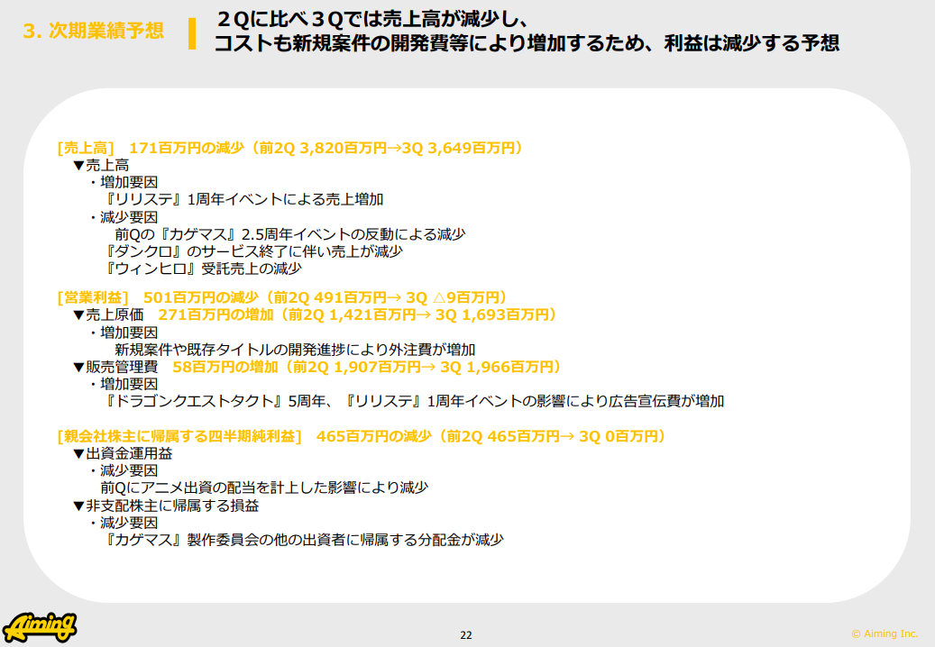 『2.5次元の誘惑 天使たちのステージ』(リリステ) や『ドラゴンクエストタクト』の1周年イベントによる売上増加が期待できる一方、『陰の実力者になりたくて!マスターオブガーデン』(カゲマス)周年後の反動減、『WIND BREAKER 不良たちの英雄譚』(ウィンヒロ)の受託売上の減少で減収を想定しているという。