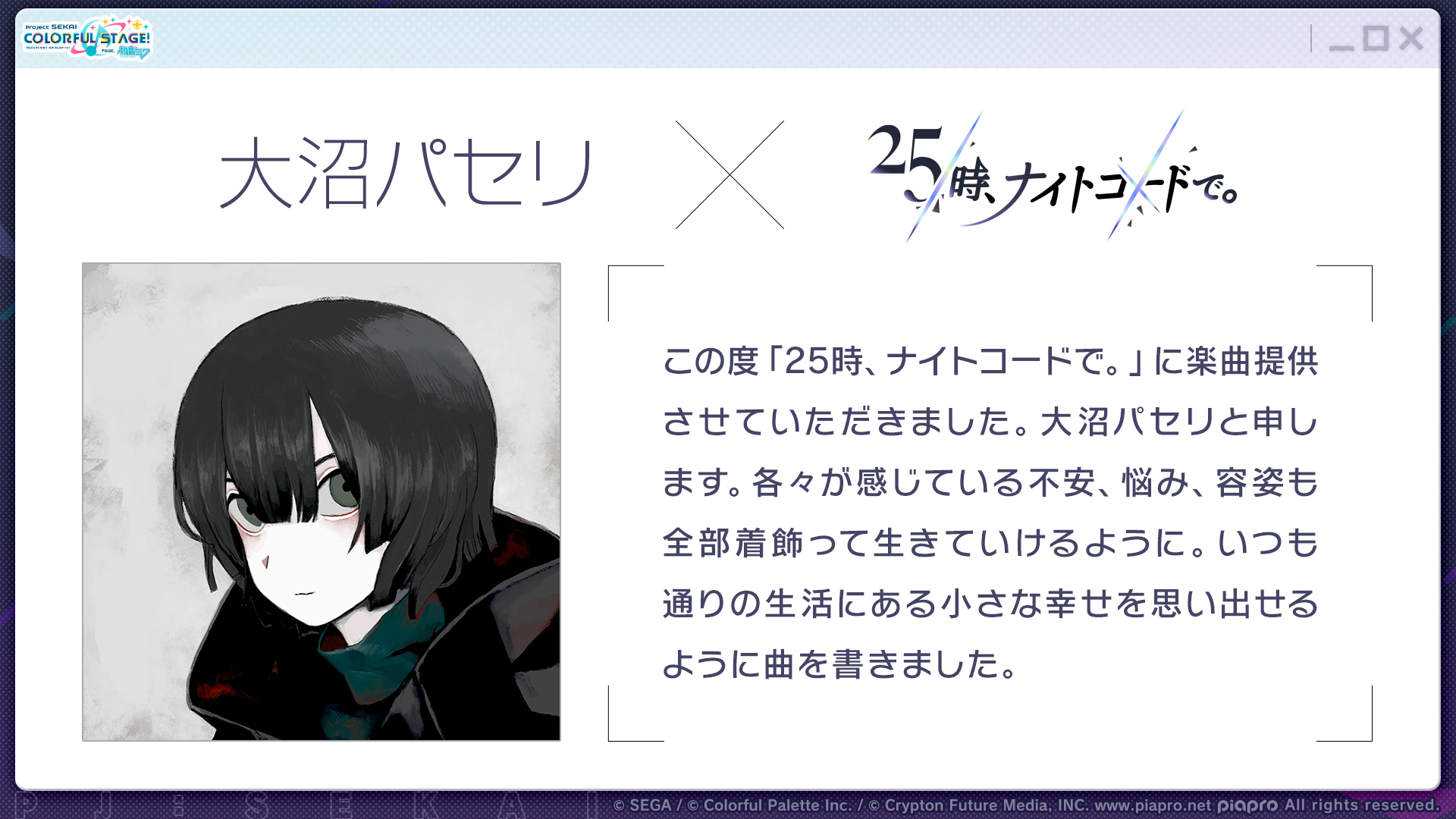 吉田夜世さんには「Vivid BAD SQUAD」の書き下ろし楽曲を、大沼パセリさんには「25時、ナイトコードで。」の書き下ろし楽曲を提供してもらう。