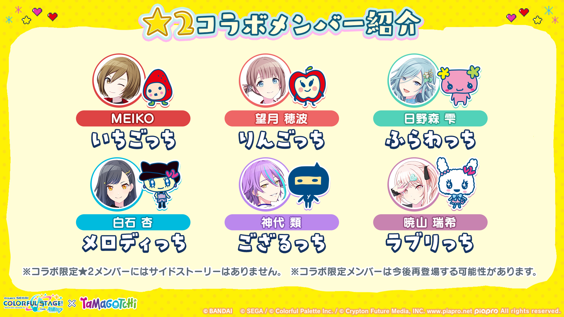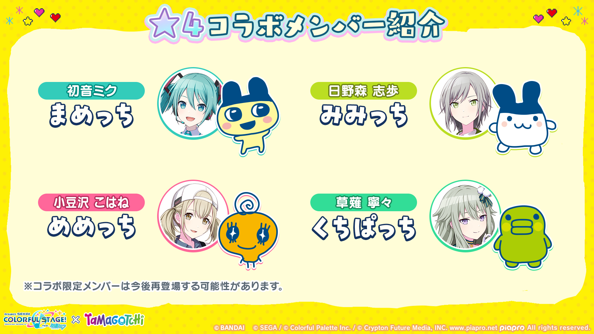 『プロジェクトセカイ』と「たまごっち」がコラボした★4・★2コラボ限定メンバーがガチャに登場いたします。メンバーは以下の通り。