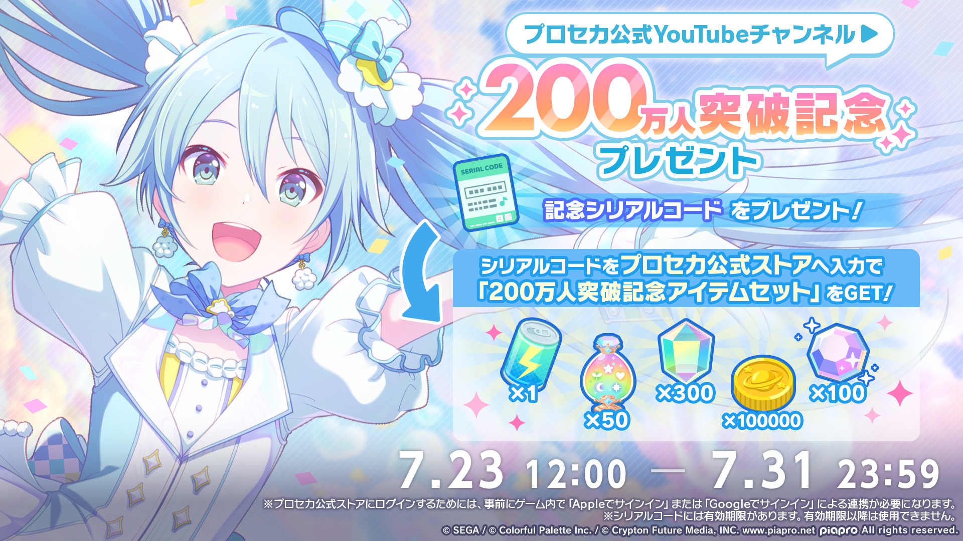 プロセカ公式YouTubeチャンネルの登録者数が200万人を突破した記念として、7月31日(木)23:59までにログインした方に、「ライブボーナスドリンク(大)」×1個、「ミラクルジェム」×50個、「クリスタル」×300個、「コイン」×100,000枚、「想いのカケラ」×100個がセットになった「200万人突破記念アイテムセット」をプレゼント。「200万人突破記念アイテムセット」は、プロセカ公式ストアで記念シリアルコードを入力することで入手することができる。