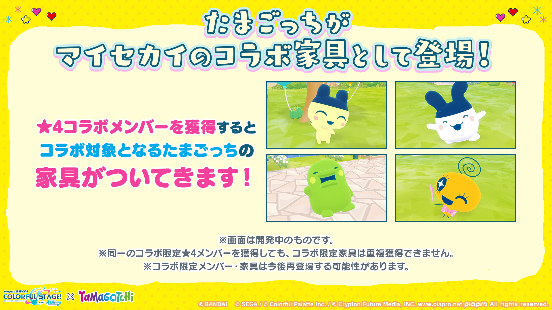 また、本ガチャで獲得した★4コラボ限定メンバーと対応する「たまごっち」が、マイセカイのコラボ家具として登場。