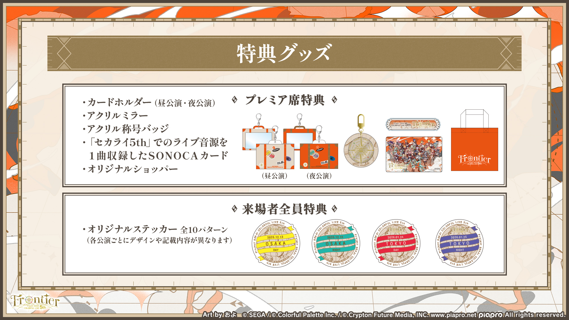 来場者全員特典として、会場や公演日の記載が入った各公演限定仕様のオリジナルステッカーをご用意しているほか、プレミア席には特典として「カードホルダー」、「アクリルミラー」、「アクリル称号バッジ」、「SONOCAカード」、「オリジナルショッパー」が付く。「SONOCAカード」は専用のスマートフォンアプリやパソコンを使って音楽をダウンロードできるカードで、裏面のシリアルコードを入力することで「セカライ5th」で実際に披露される楽曲1曲のライブ音源をダウンロードすることができる。