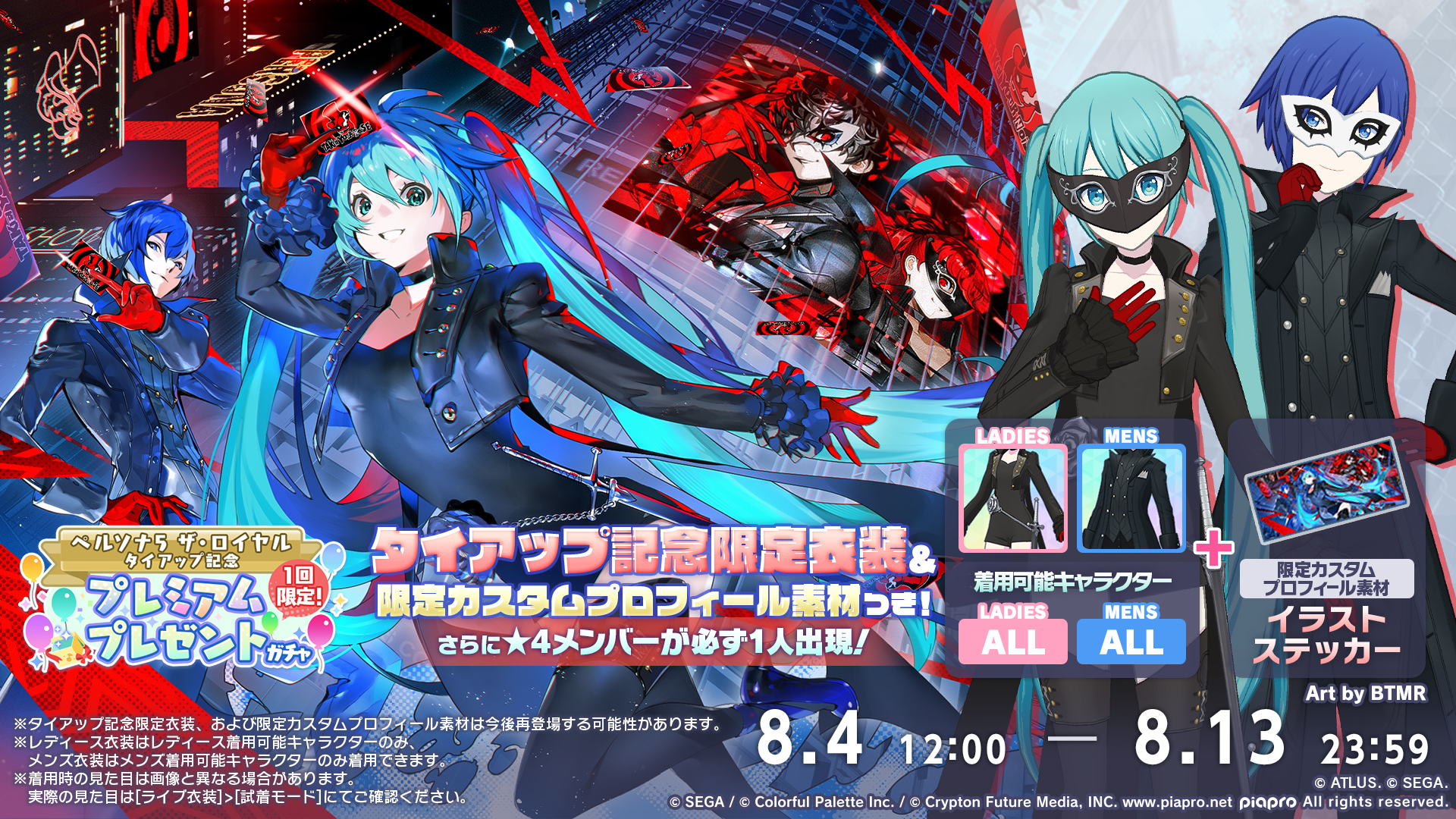 「[ペルソナ5 ザ・ロイヤルタイアップ記念]プレミアムプレゼントガチャ」とは、「ペルソナ5 ザ・ロイヤル」に登場する「ジョーカー」と「ヴァイオレット」をモチーフにしたタイアップ記念限定衣装と、記念イラストを使用した限定カスタムプロフィール素材が付属するほか、★4メンバーが必ず1人出現するガチャとなっている。