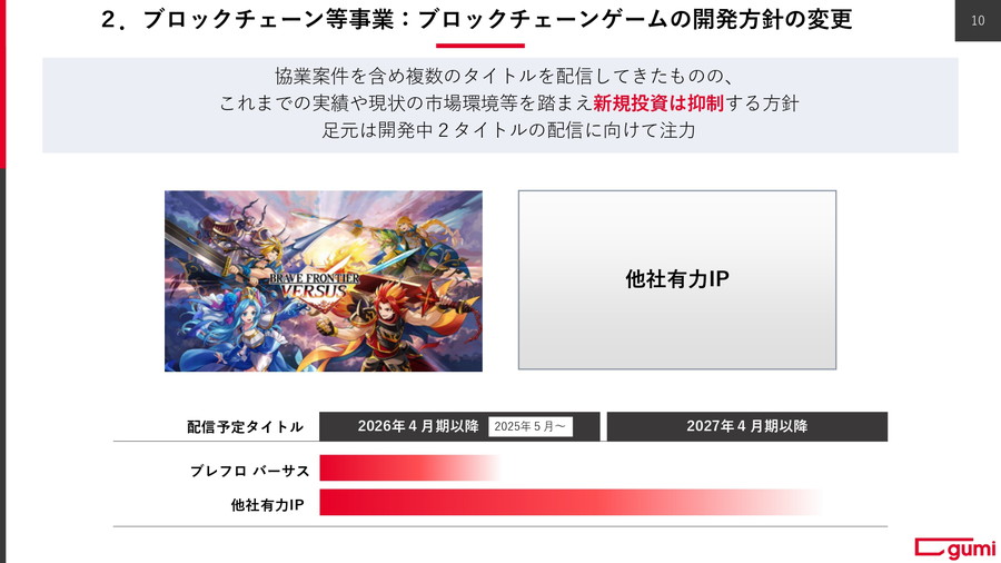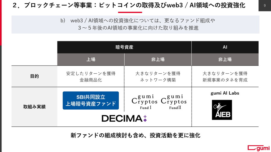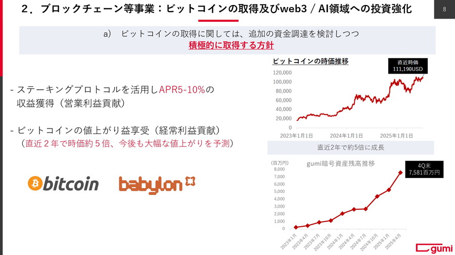 稼ぎ頭となっているブロックチェーン等事業では、ビットコインの取得やWeb3・AI領域のファンドの組成を行うとともに、SBIグループのネオメディア戦略との連携など図る。トークン(OSHI・FCT)継続受領や、ビットコインへの投資利益、ブロックチェーンゲーム『ブレフロ バーサス』のリリースで収益を稼ぐ。
