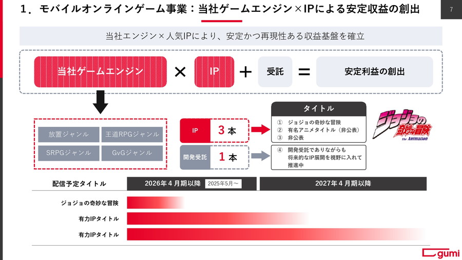 また、モバイルゲーム事業については黒字転換を見込んでいる。自社ゲームエンジンとIPを軸としたゲームを提供することで安定収益の創出を目指す。不採算タイトルからの撤退や国内外の人員適正化が完了し、再出発を図る。複数本のIPタイトルの開発を行っているほか、『ジョジョの奇妙な冒険』を第2四半期(25年8~10月)にリリースする予定だ。